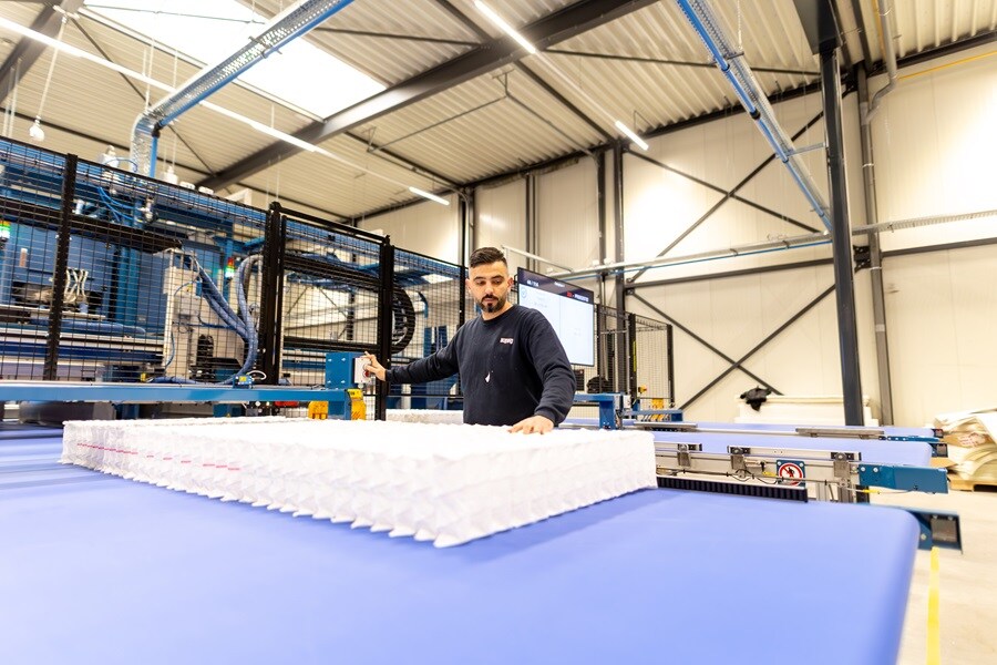 Tijdens het gesprek haalt Jan-Joost Bosman, sinds 2017 CEO van Auping, een model van matras Evolve op. Dit is de door Auping...