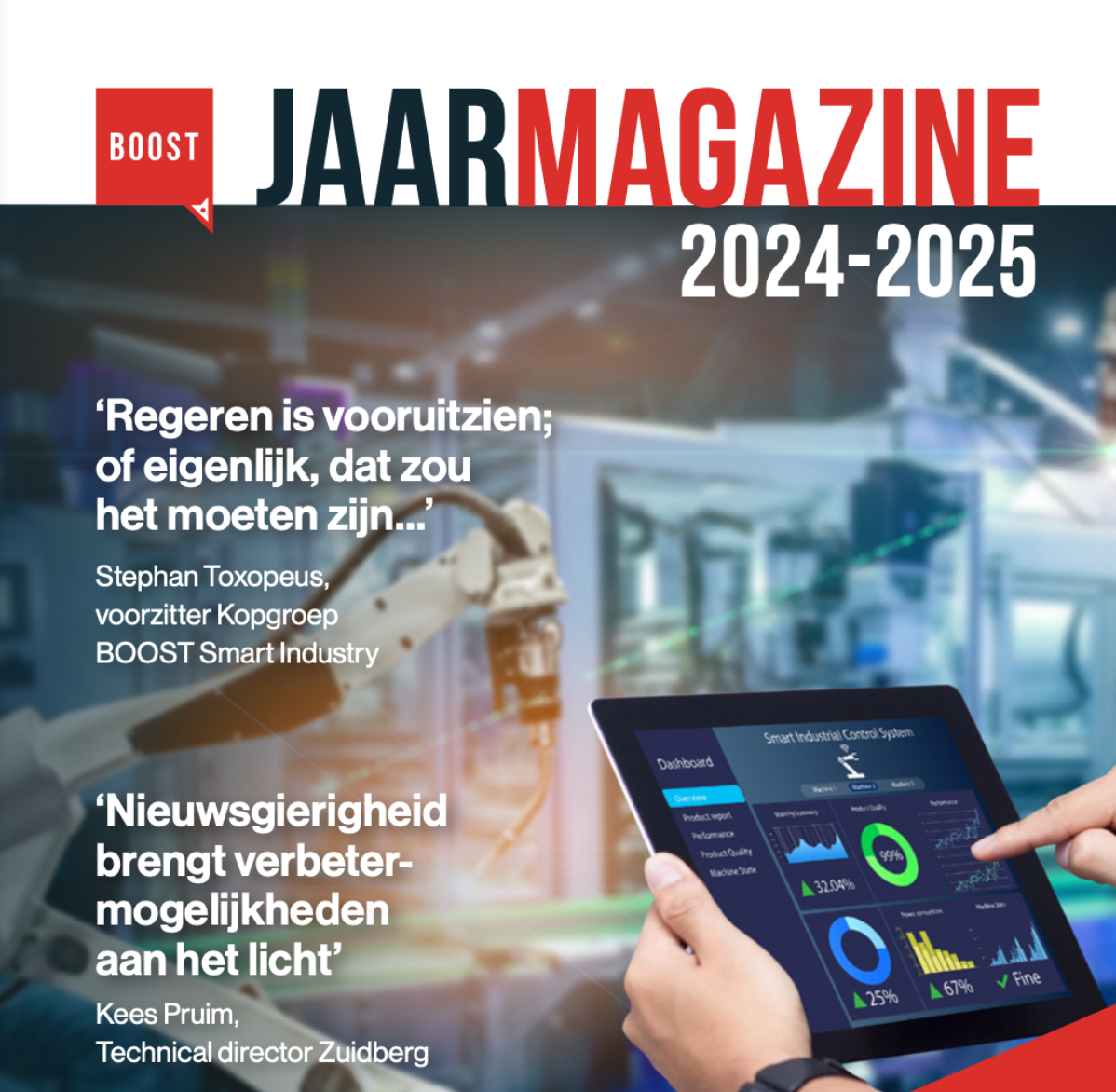 Dit jaarmagazine is samengesteld om bedrijven te informeren en inspireren over de kansen en mogelijkheden rond slim en schoon produceren. Dit doen we door de ontwikkelingen op het gebied van smart industry te duiden en toe te lichten aan de hand van praktijkvoorbeelden uit de industrie. We kijken terug op 2024, het tweede jaar van EDIH BOOST Robotics, en vooruit naar de kansen die 2025 biedt op het gebied van digitalisering, circulair ondernemen en innovatie.