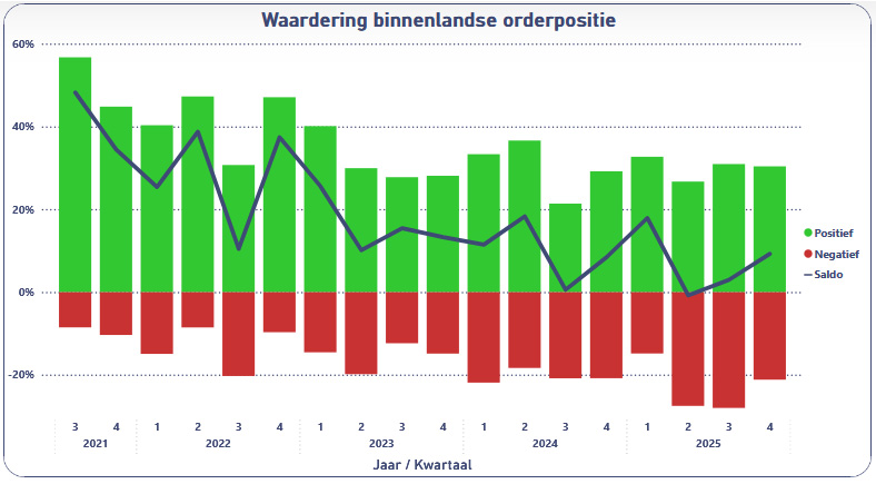 De binnenlandse orderpositie blijft in het vierde kwartaal 2025 per saldo negatief, net als in het voorafgaande kwartaal. Het saldo komt uit op -2 procent, een lichte verbetering vergeleken met het saldo -7 procent in het derde kwartaal. Deze verbetering wijst op een voorzichtig herstel van de binnenlandse vraag. De verwachting bij ondernemers is wel dat het saldo van de orderpositie weer terugvalt naar -7 procent. De waardering van de orderportefeuille laat daarentegen een licht positiever beeld zien met een saldo van +9 procent.