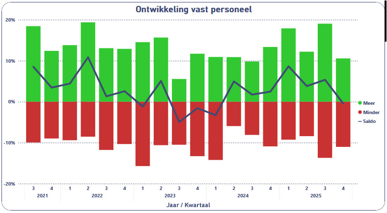 Het aandeel bedrijven met openstaande vacatures is gedaald van 54 procent in het derde kwartaal naar 44 procent in het vierde kwartaal. Tegelijkertijd stijgt het gemiddeld aantal vacatures per bedrijf licht, van 2,21 naar 2,31. Dit betekent dat minder bedrijven actief werven, maar dat de wervende bedrijven een iets grotere personeelsbehoefte hebben.