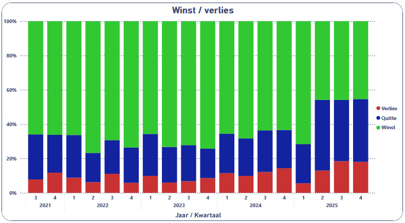 Het bedrijfsresultaat ontwikkelt zich iets positiever dan in het derde kwartaal. Het aantal bedrijven met een stijgend resultaat en het aantal bedrijven met een dalend resultaat is vrijwel in balans. Het aandeel winstgevende bedrijven blijft voor het derde kwartaal op rij stabiel op 45 procent. Daarnaast draait 37 procent van de bedrijven break-even. Het aandeel van bedrijven dat met verlies draait, blijft ongewijzigd op 18 procent. Daarmee opereert ruim vier op de vijf MKB-maakbedrijven winstgevend of kostendekkend.